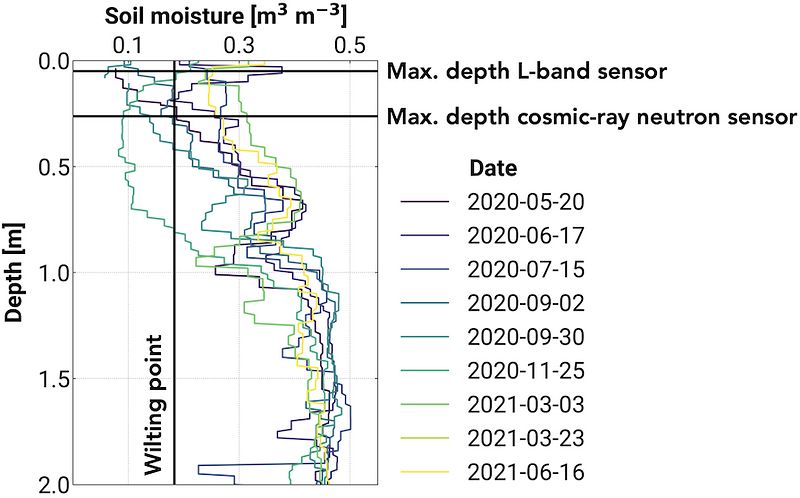 Recent soil moisture products have not yet targeted profile soil moisture estimates derived from cosmic-ray neutron sensors (CRNS) despite their unique footprint. CRNS have a capability to integrate measurements over a volume of ~300 m in radius and ~30 cm in depth, surpassing other in-situ techniques. This extraordinary coverage presents a distinct advantage for gauging plant water availability, which provides valuable information for managing water resources, particularly in farming and land-use planning. To extend the sensor’s benefits from station to raster scale, the combination of high-resolution remote sensing data with artificial intelligence models is being pursued. This can offer significant advantages in improving the vertical accuracy of satellite-based soil moisture products.